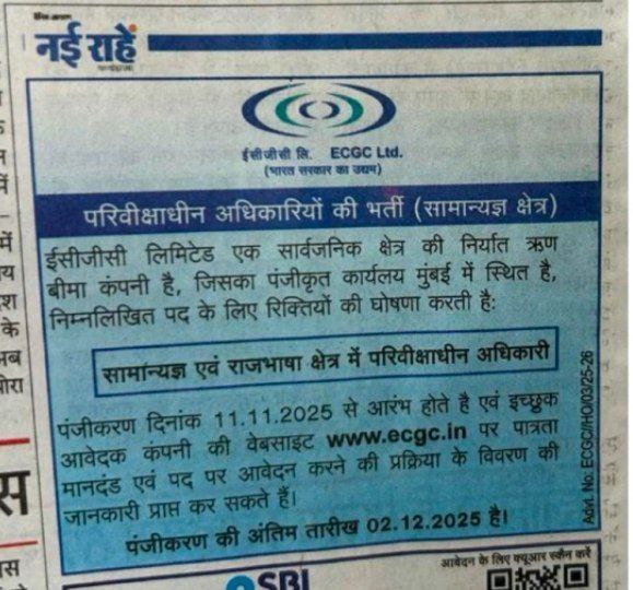 Export Credit Guarantee Corporation of India Limited : has released the official notification for the Probationary Officer (Generalist, Rajbhasha) Vacancy 2025. The ECGC Probationary Officer (PO) Online Form 2025 application form process has start on 11/11/2025, and interested candidates can fill the online form until 02/12/2025.